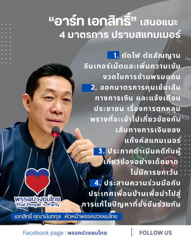 ท่ามกลางสถานการณ์ภัยคุกคามทางออนไลน์ที่ทวีความรุนแรงขึ้นอย่างต่อเนื่อง สร้างความเสียหายแก่ประชาชนเป็นวงกว้าง นายเอกสิทธิ์ ปานสมสวย หรือ “อาร์ท” เลขาธิการพรรคพลังไทย ได้ออกมาแสดงความห่วงใย พร้อมเสนอแนวทางแก้ไขปัญหาอย่างเป็นรูปธรรม โดยเรียกร้องให้รัฐบาลดำเนินการปราบปรามกลุ่มมิจฉาชีพและสแกมเมอร์อย่างจริงจัง เพื่อปกป้องความปลอดภัยในชีวิตและทรัพย์สินของคนไทย